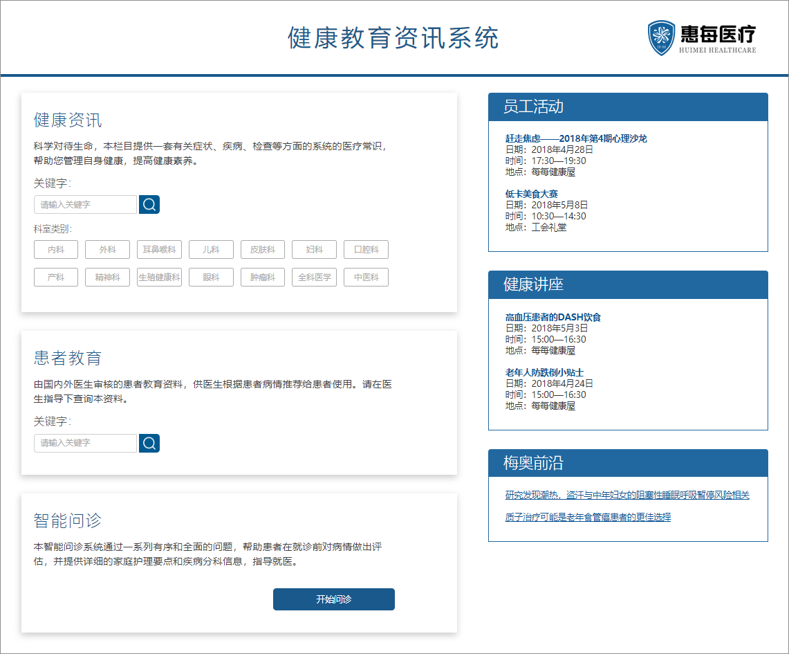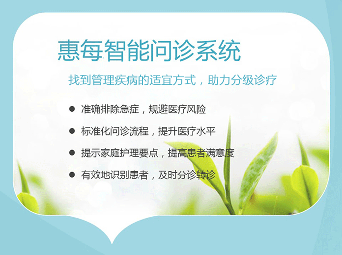 2016年,惠每医疗全面引进 妙佑医疗国际(Mayo Clinic) AMC并开发了惠每智能问诊系统。惠每智能问诊系统不仅可以帮助患者及时和有效就诊,更重要的是可以帮助各级卫生服务机构和保险公司有效地识别患者,把患者分诊到合适的医疗场所和相应的专家体系中。同时,惠每智能问诊系统可以规范全科医生和客服热线的问诊流程,防止严重疾病的漏诊,保障患者安全
